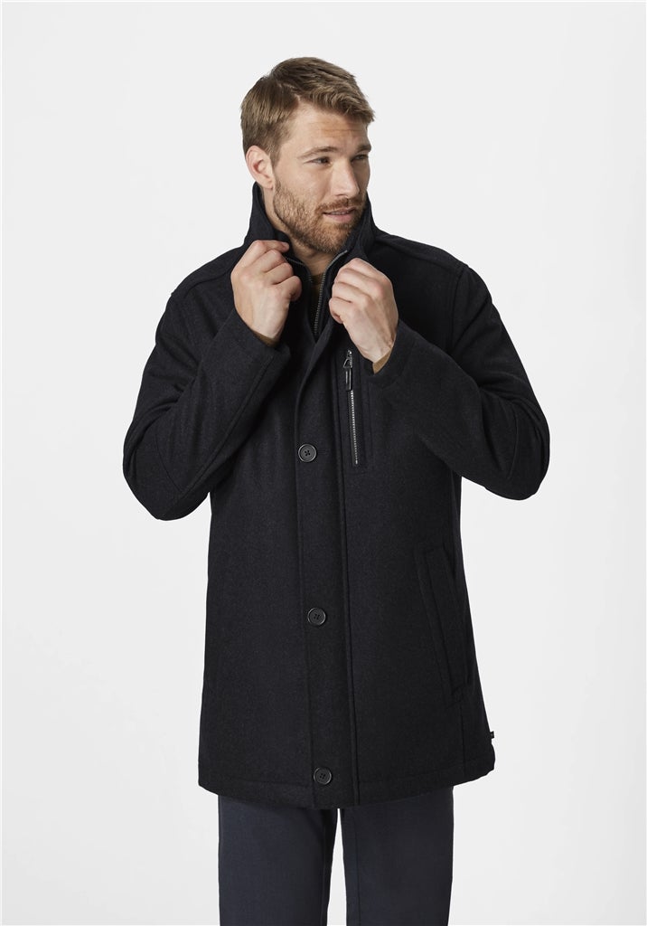 Redpointin tyylikäs villakangastakki, jossa on vetoketjukiinnitys ja nappilista. Edessä on yksi vetoketjullinen rintatasku sekä kaksi avotaskua. Takin sisäpuolella on yksi vetoketjullinen povitasku, sekä yksi napillinen povitasku. Väri on musta. Koot 50-60.